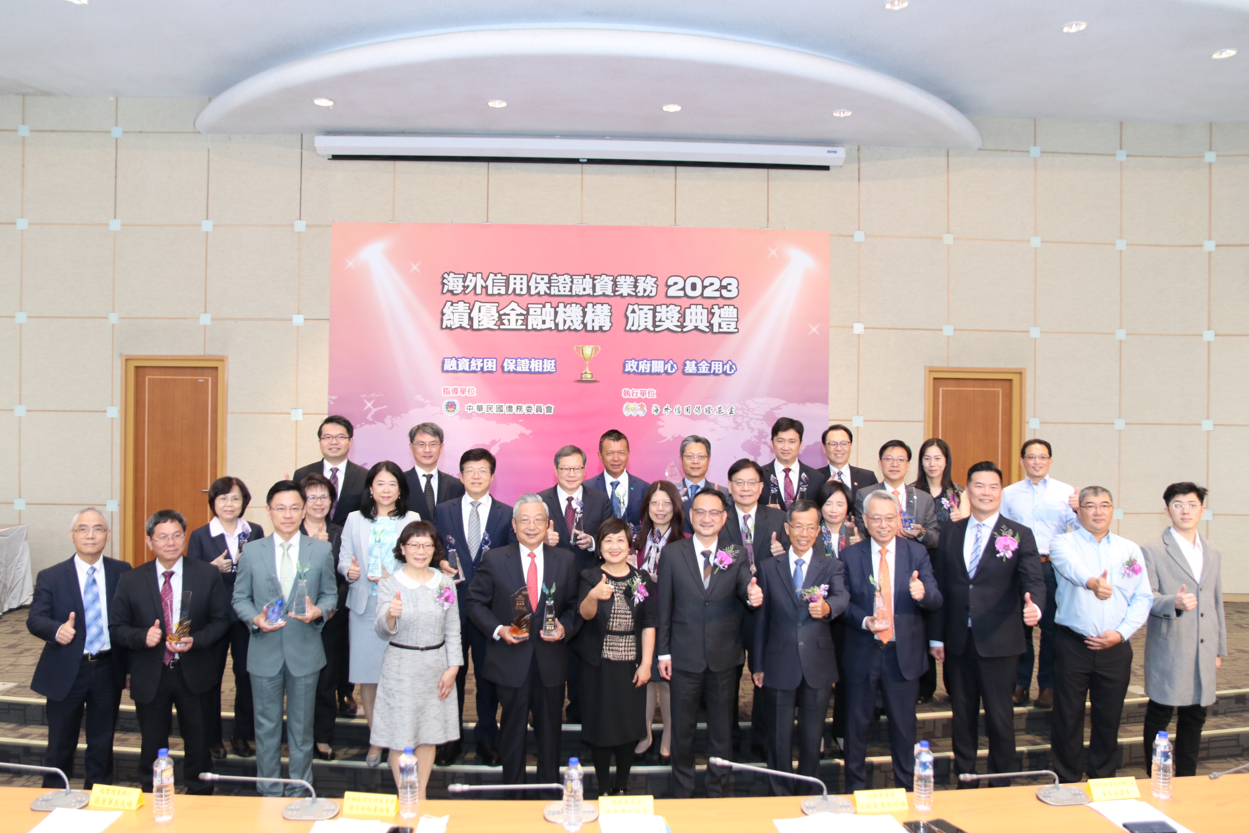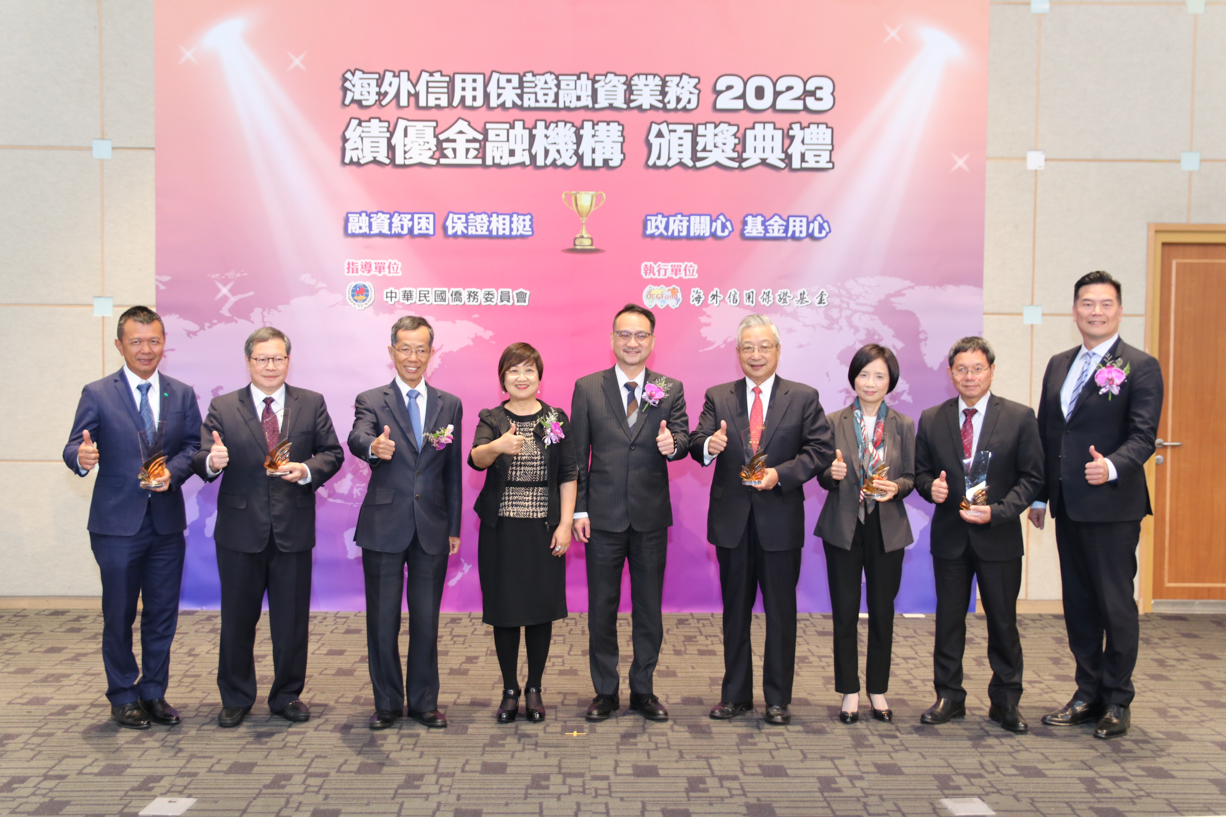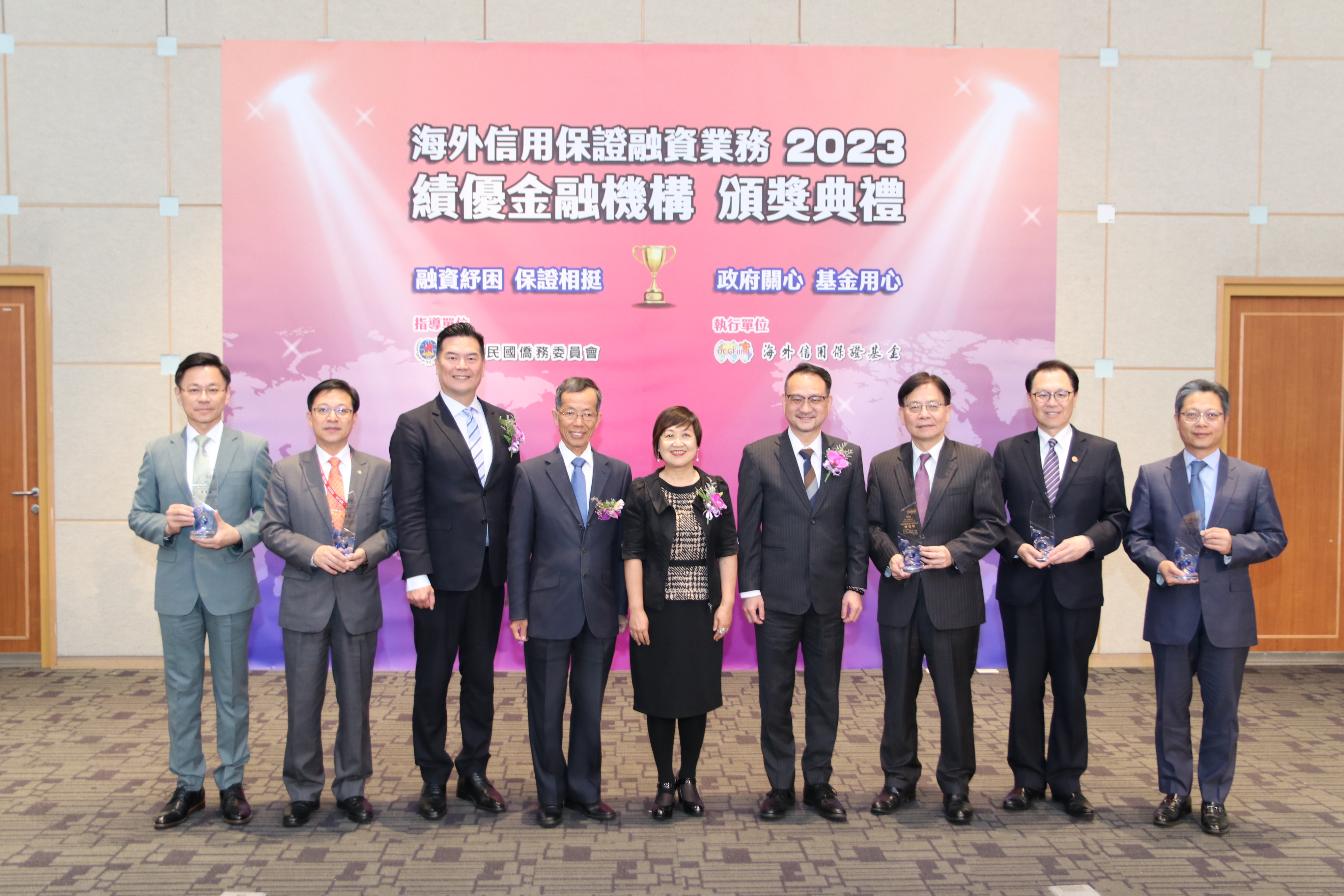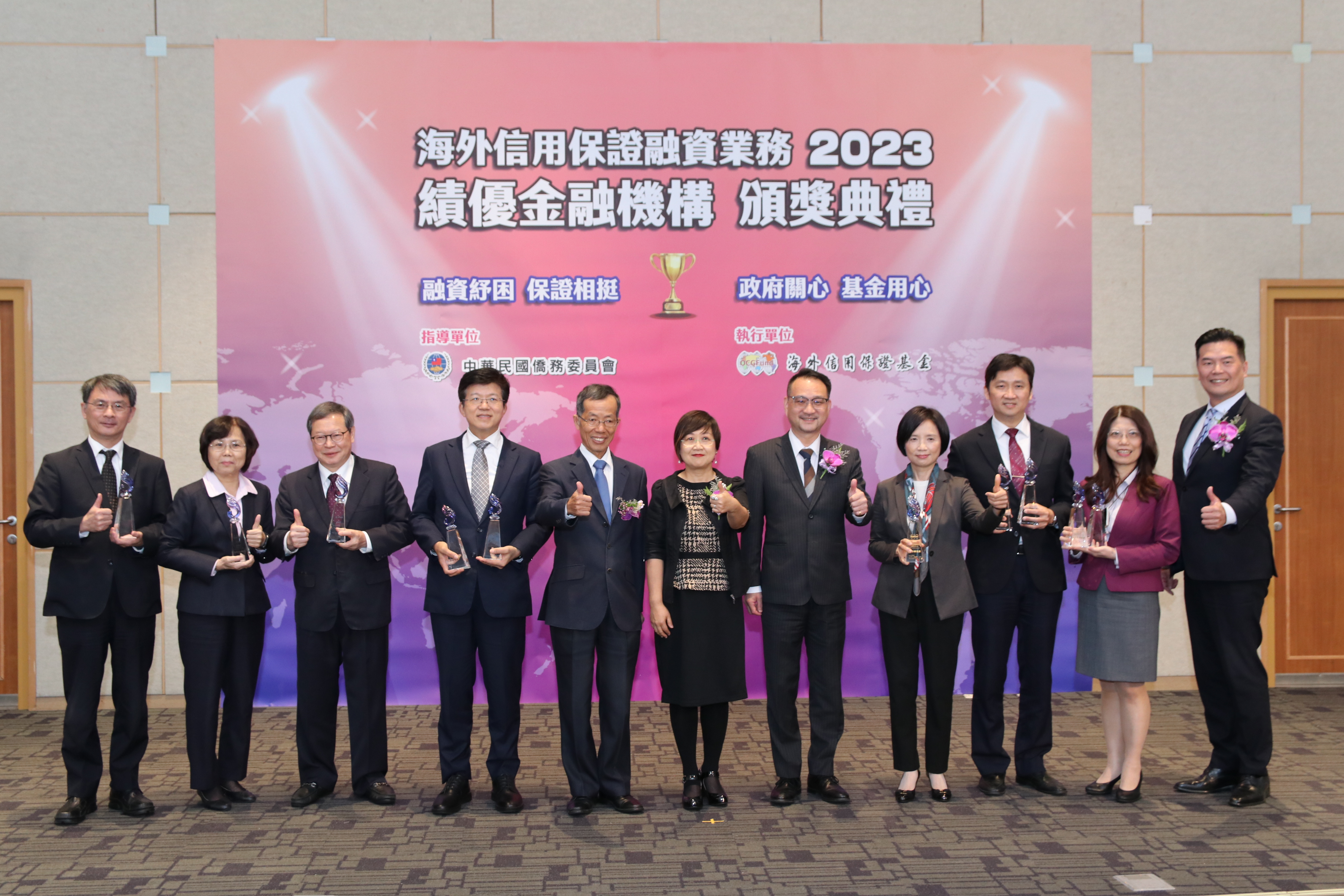 海外信用保證基金(9)日舉行「111年度績優金融機構頒獎典禮」,計有10家銀行獲獎,分別由僑務委員會委員長徐佳青及副委員長阮昭雄、金管會主秘蔡福隆及和行政院經貿談判辦公室參議黃建章擔任頒獎人,並有來自泰國及新加坡之臺商出席見證。