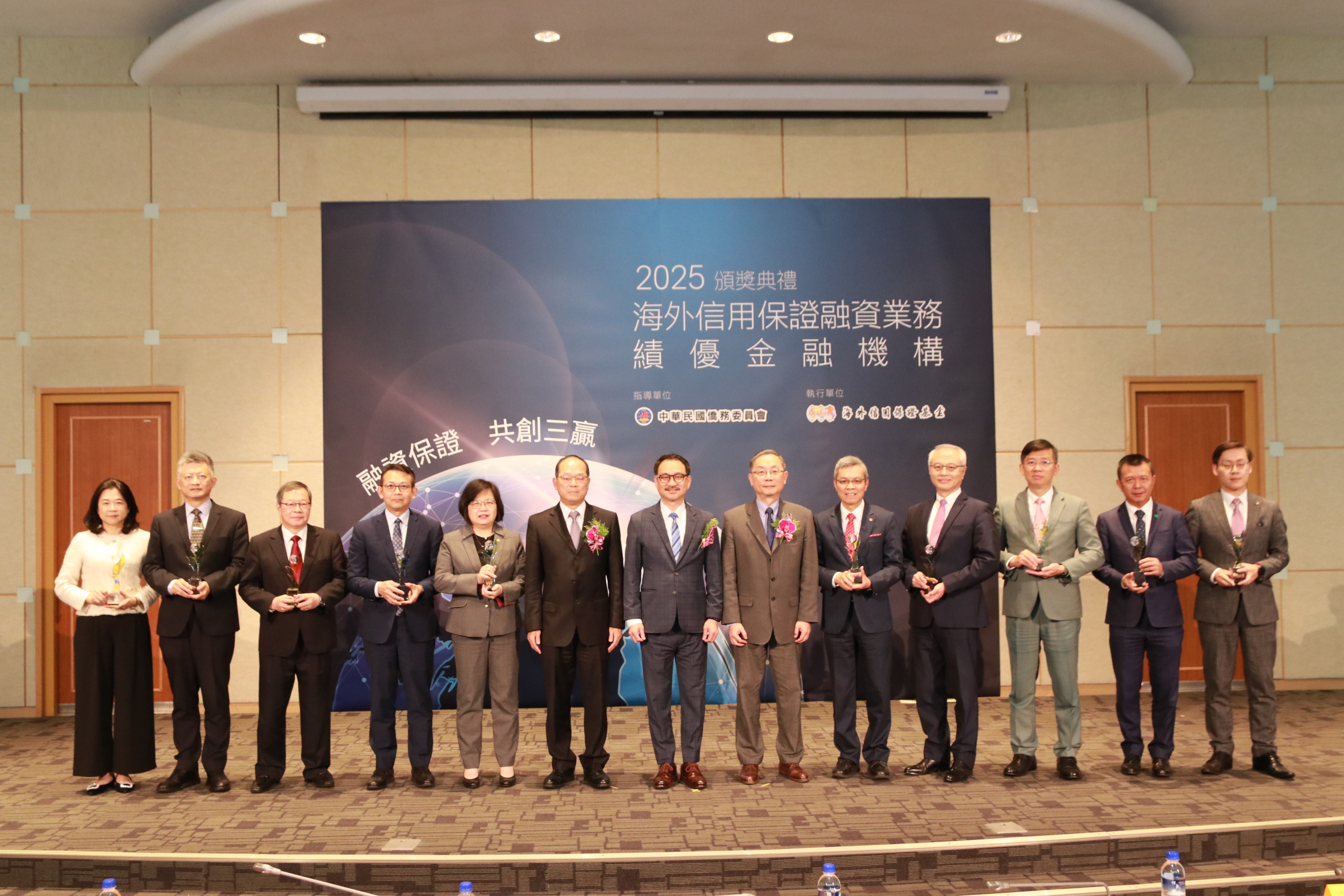 海外信用保證基金表揚績優銀行,主要是為了感謝銀行全力配合政策協助臺僑商取得融資在海外發展事業,並藉此強化與銀行之合作夥伴關係。本次共頒發三大獎項,包括「總送保融資金額績優獎」、「新南向國家融資金額成長績優獎」及「分行送保績優獎」,獲獎銀行有兆豐銀行、華南銀行、上海銀行、第一銀行、臺灣銀行、玉山銀行、台新銀行、中國信託銀行、臺灣企銀、國泰世華銀行、永豐銀行及台中銀行等12家銀行。