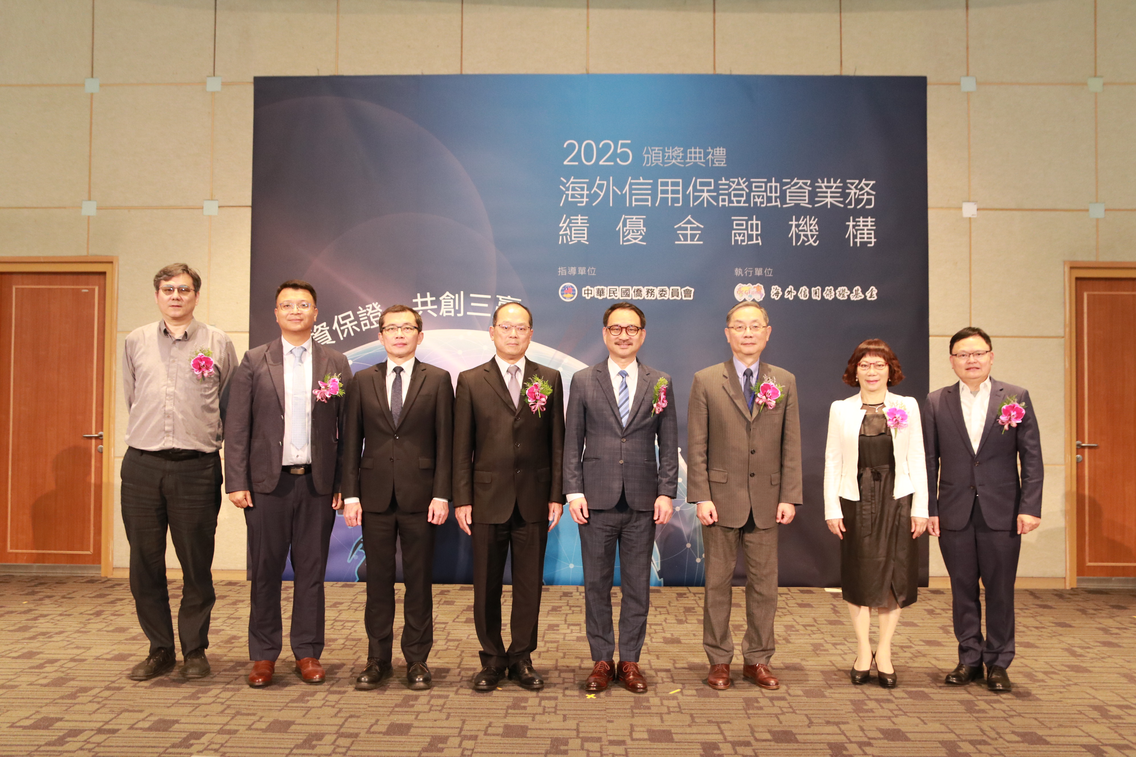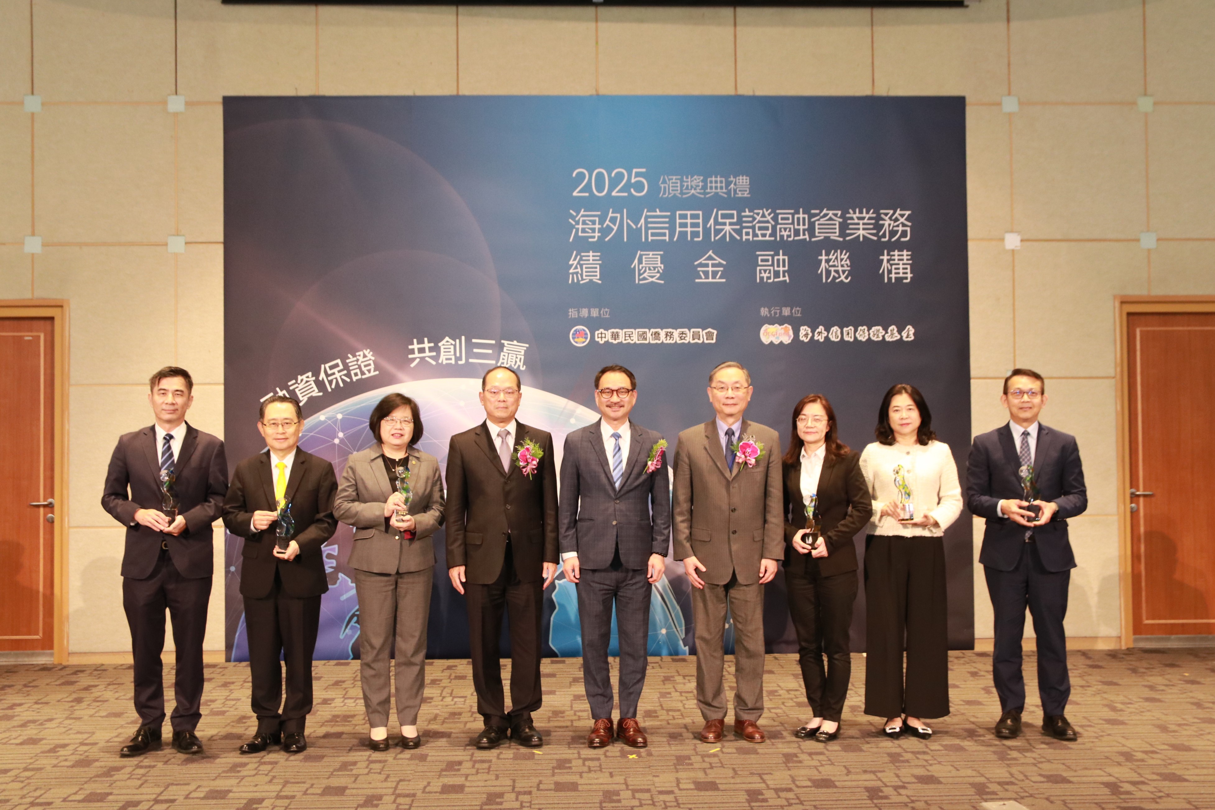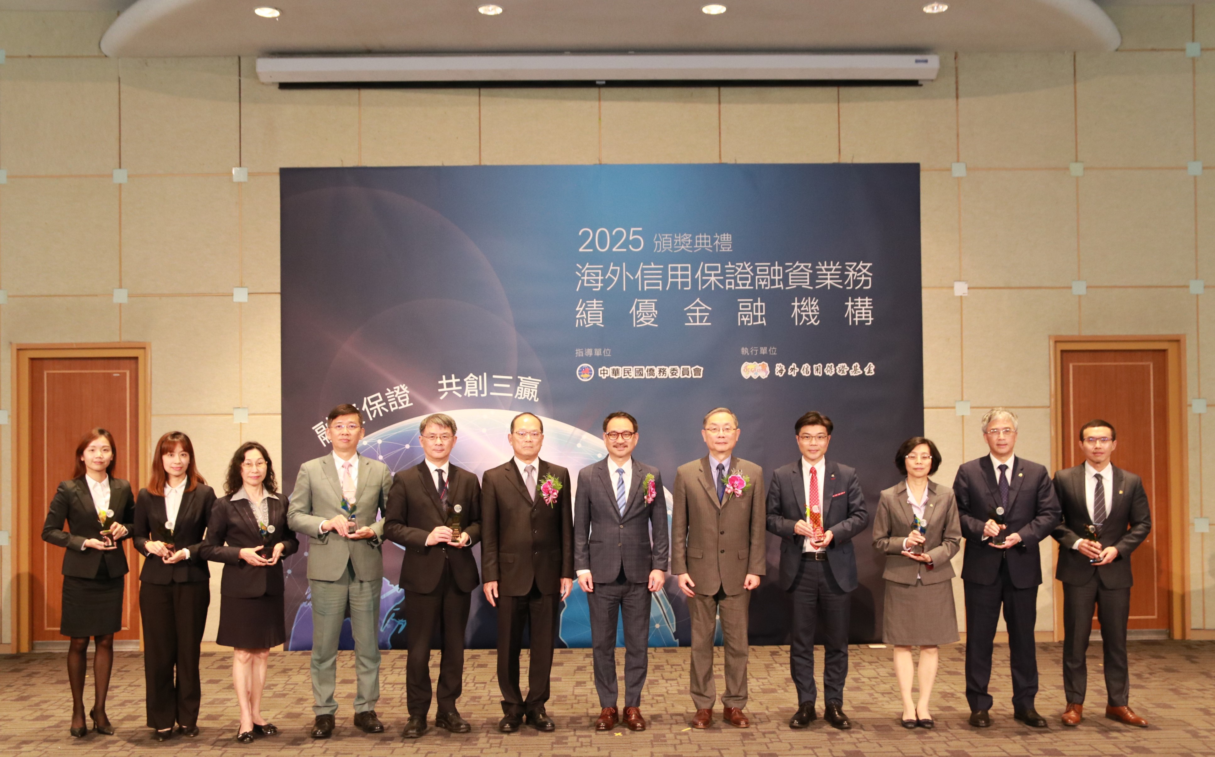 海外信用保證基金於(8)日舉行「113年度績優金融機構頒獎典禮」,計有12家銀行獲獎,邀請僑務委員會副委員長阮昭雄、金融監督管理委員會主任秘書林志吉及行政院經貿談判辦公室談判代表張煜霖擔任頒獎人,並有來自泰國、馬來西亞及越南之臺商出席見證。