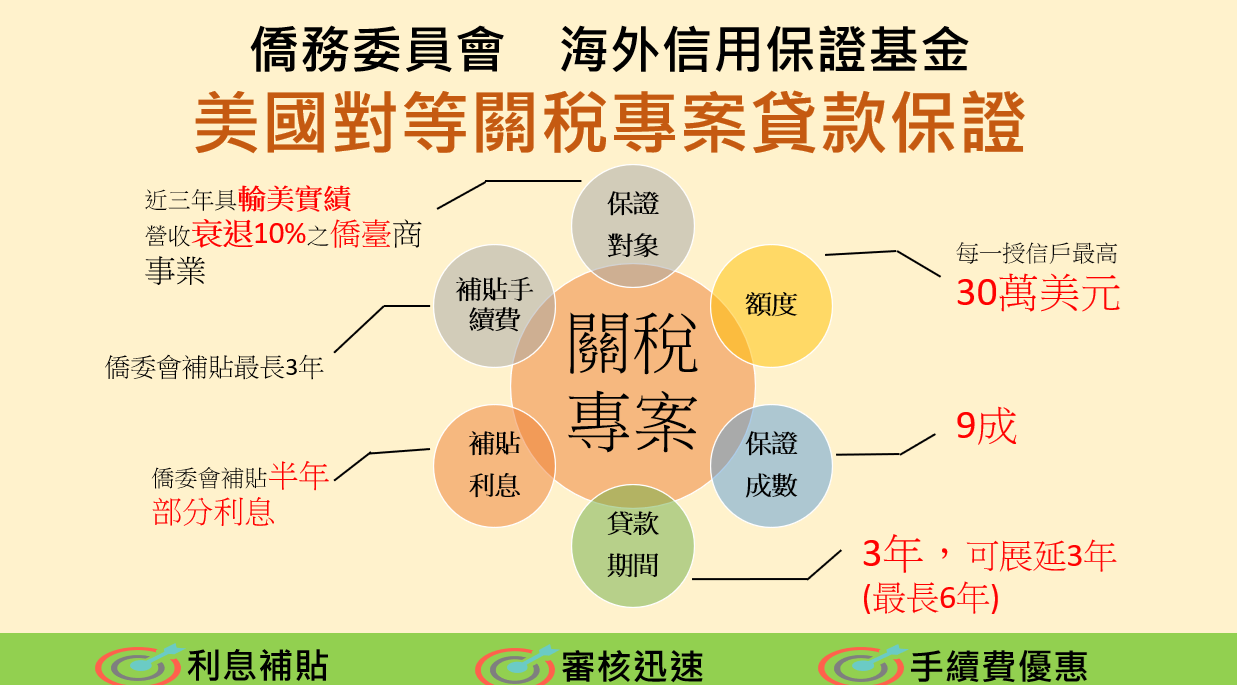 本基金配合政府政策並遵照僑務委員會指示,特推出「美國對等關稅專案」,針對近三年具輸美實績,受關稅影響致營業額減少10%之僑臺商事業,提供貸款額度最高30萬美元,保證成數9
