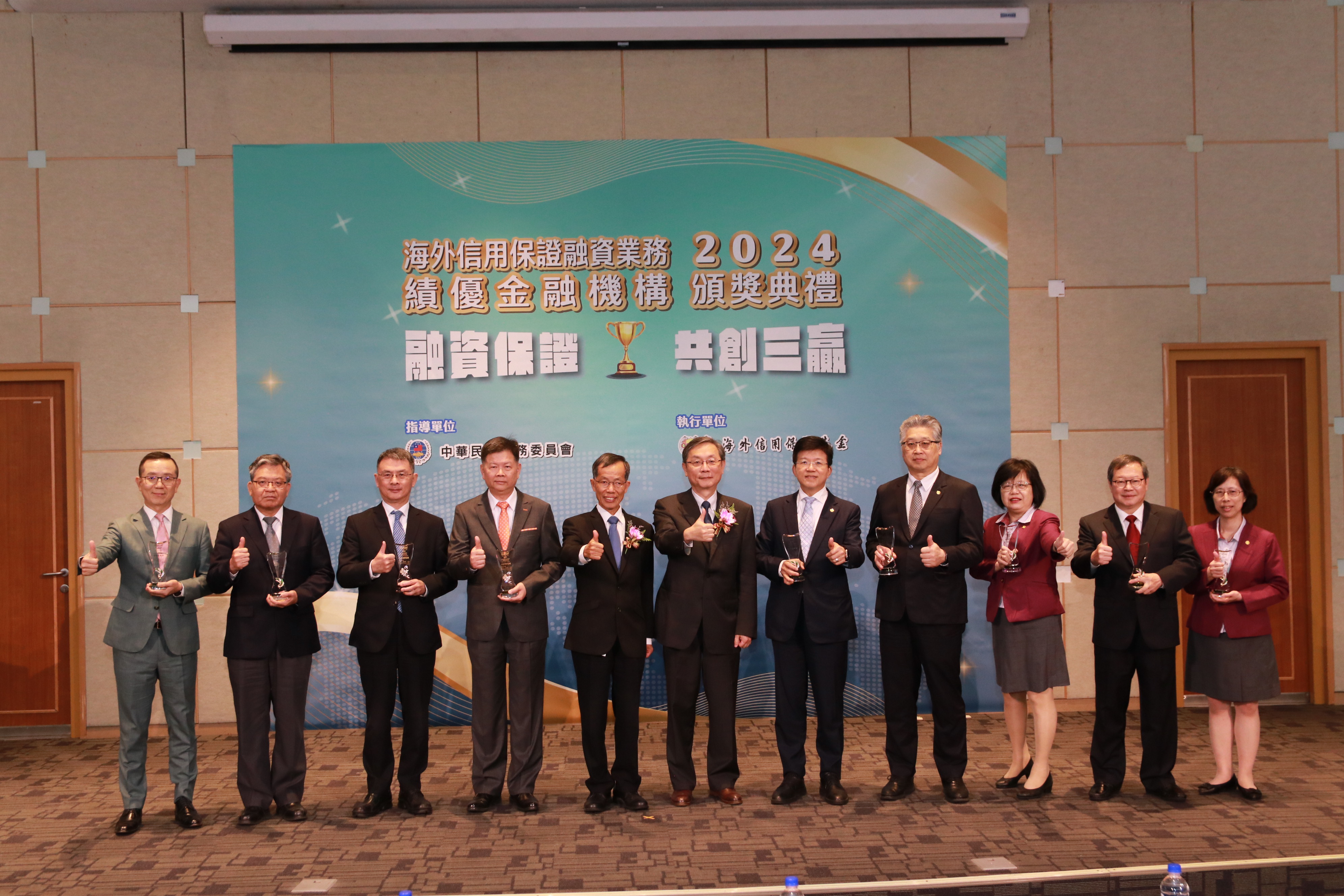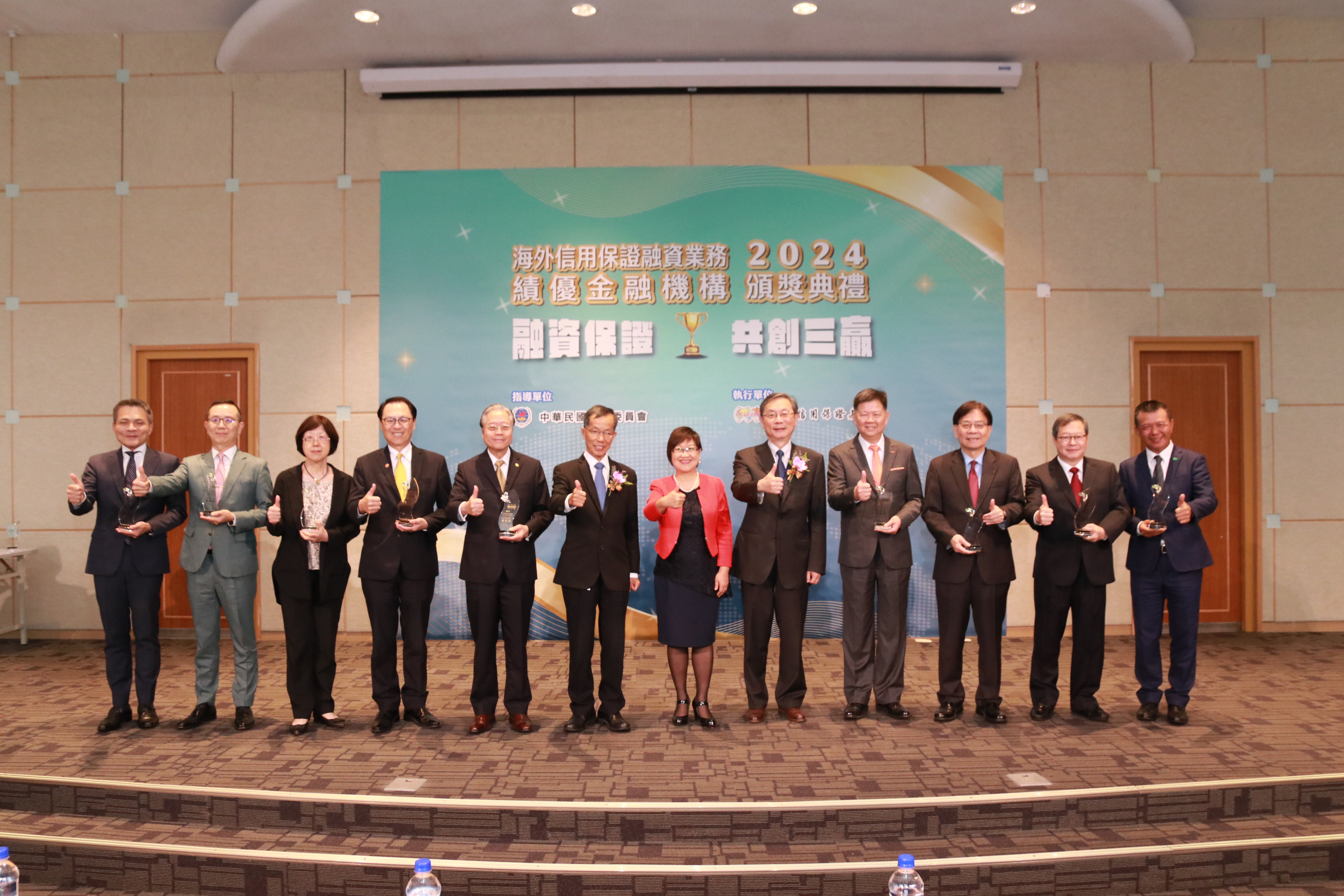 ,並藉此強化與銀行之合作夥伴關係。本次共頒發三大獎項,包括「總送保融資金額績優獎」、「新南向國家融資金額成長績優獎」及「分行送保績優獎」,獲獎銀行有兆豐、上海、華銀、中信、臺銀、玉山、一銀、國泰世華、永豐、合庫及新光銀行等11家銀行。